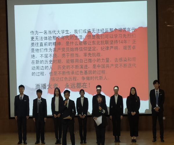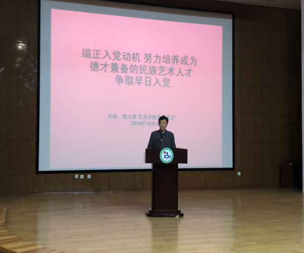 本次培训首先由艺术学院“青马宣讲团”的学生党员和积极分子,以“重走抗联路,旧地筑党魂”为题,用一幅幅图片、栩栩动人的讲述再现了小汪清抗联英烈们14年艰苦卓绝、英勇抗战的历史画面。经过宣讲团员们的生动的阐释使听众们对中国共产党的历史、艰苦历程有了感性而又深刻的认识,丰富了我院大学生思想教育的形式。而后,学院党委徐大成书记以“端正入党动机,努力培养成为德才兼备的民族艺术人才,争取早日入党”为专题讲党课。徐大成书记从党的性质、指导思想、入党积极分子首先要端正入党动机、严格按照入党要履行的手续,吸收学生当中学业和综合素质突出的、有服务意识和奉献精神的先进分子加入到中国共产党的大家庭中。使参训学生对党的理论知识有了深刻的理解与认识,既让2019级全体新生深刻了解了党史、党章知识的重要性,更是一次对我院全体积极分子以及2019级新生世界观、人生观、价值观的教育引导。