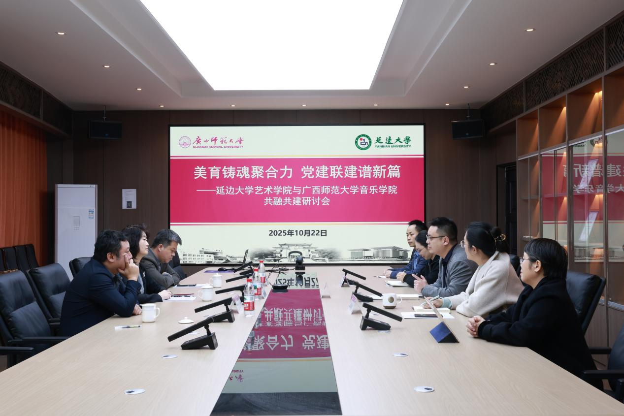 为深入贯彻落实新时代党的建设总要求,以高质量党建赋能学院事业高质量发展,10月22日,延边大学艺术学院赴广西师范大学音乐学院开展共建交流活动。此次活动旨在通过互学互鉴,探索党建与艺术教育深度融合的新路径、新模式。