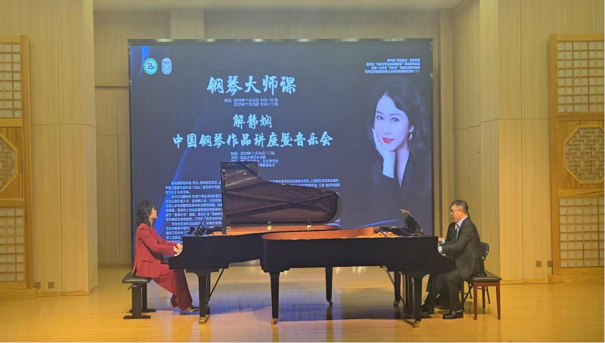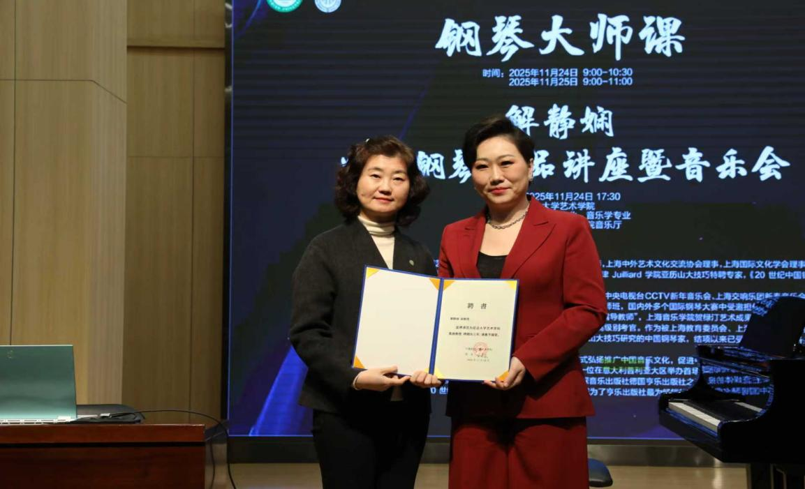 11月24日,延边大学艺术学院第六期“艺途时光・名家殿堂”系列活动圆满落幕。本次活动特邀著名旅德钢琴家、上海音乐学院解静娴副教授主讲,分为“中国钢琴作品”主题讲座、音乐会及大师班传艺三大环节,旨在深化钢琴教学实践、推动音乐文化传播,艺术学院党委书记李智渊、党委副书记娄安钢出席活动,副院长姜渊中主持讲座暨音乐会环节。