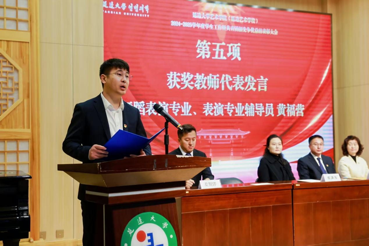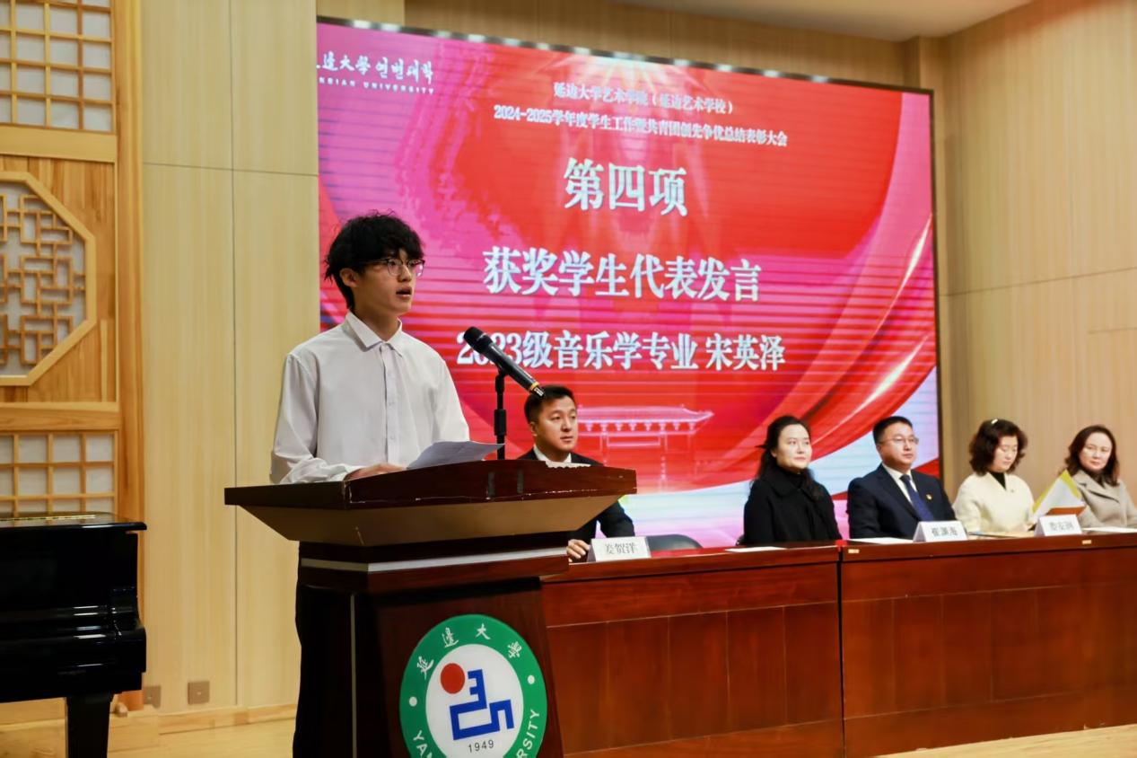 2025年12月6日,延边大学艺术学院(延边艺术学校)2024-2025学年度学生工作暨共青团创先争优总结表彰大会在音乐厅举行。艺术学院领导班子出席大会。大会由学工办主任主持。