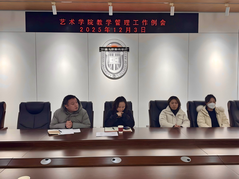 12月3日,延边大学艺术学院教学管理工作例会顺利召开,院长金英花、副院长姜渊中、教科办、各专业及教研室主任参会。本次会议围绕本科教学质量报告解读、教学工作交流、后续工作部署”三部分展开,会议由姜渊中主持。