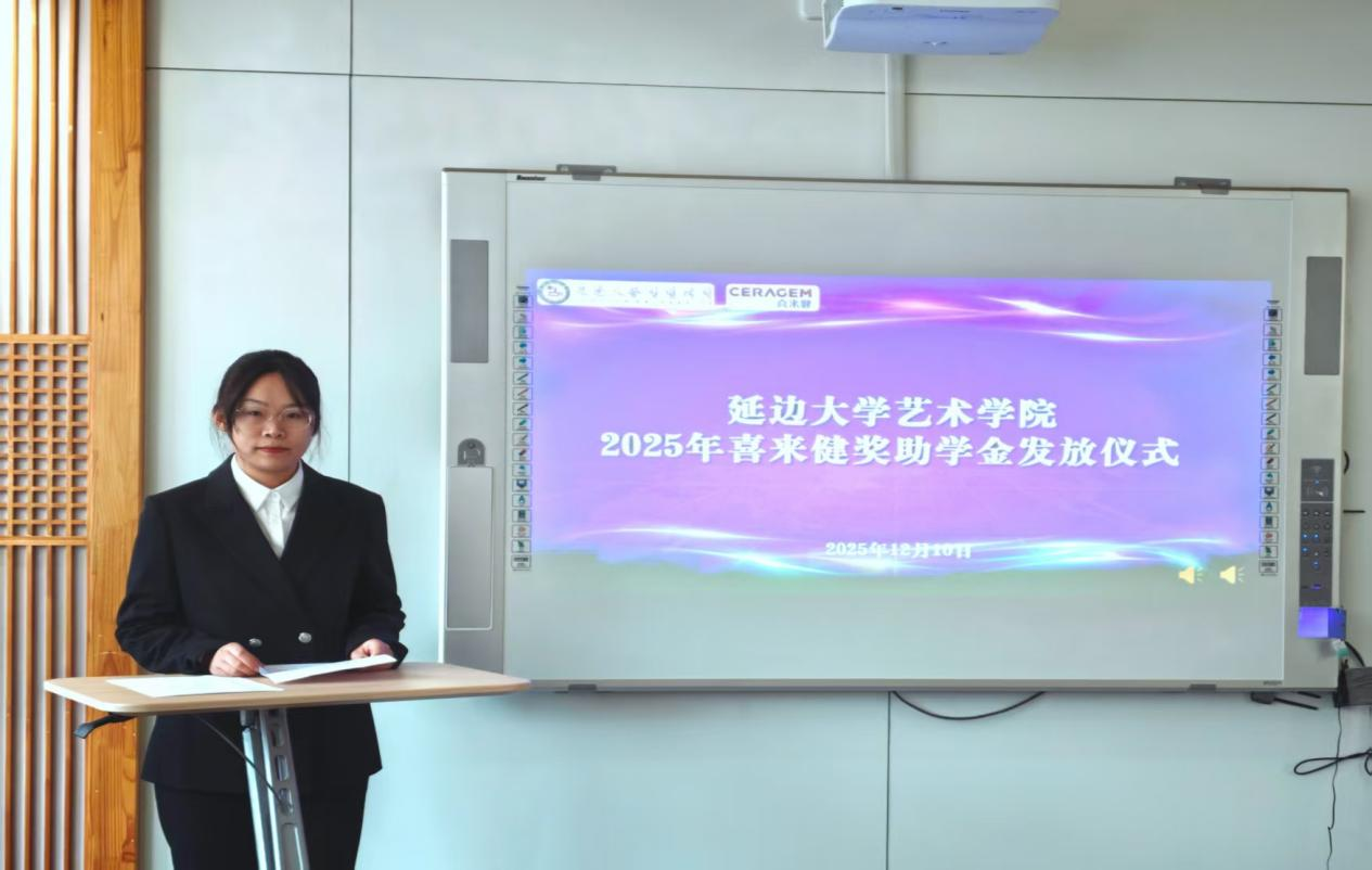 12月10日中午,艺术学院在二楼多功能会议室举行了2025年延边大学“喜来健”奖助学金捐赠发放仪式。学院党委书记李智渊,副书记娄安钢、各专业辅导员及全体受表彰学生参加仪式。