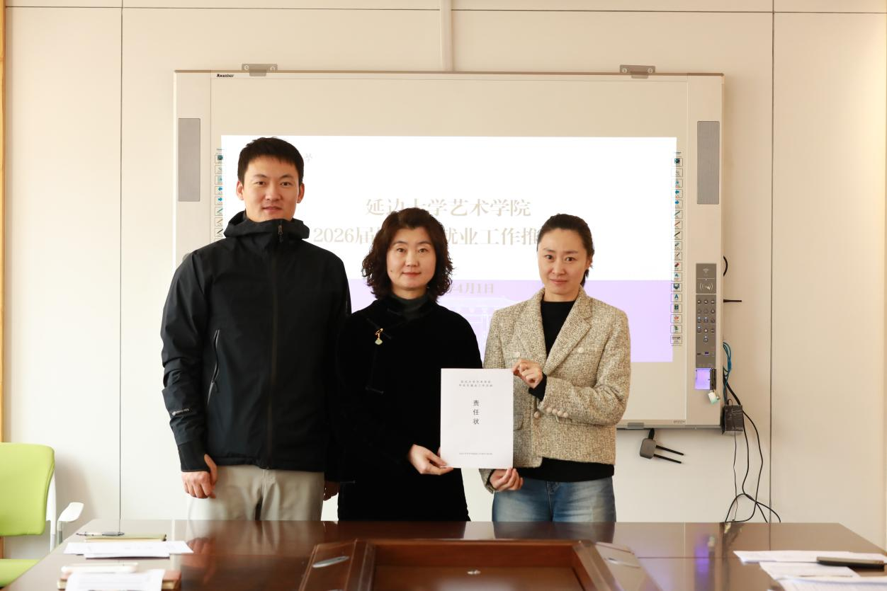 姜贺洋介绍了学院2026届毕业生就业工作方案,通报了各专业就业落实情况及下一阶段重点任务与举措。各学科、专业负责人向学院递交了《艺术学院2026年就业工作目标责任状》。